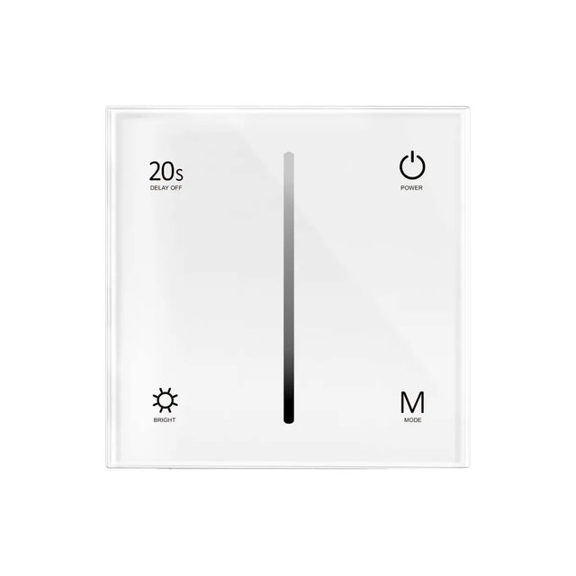 The dimmer features a touch glass panel with an ultra-sensitive touch slider and backlighting. With the slider, you can gradually dim or brighten the lighting up to 100%. The panel is made of strong glass and has a modern appearance.