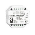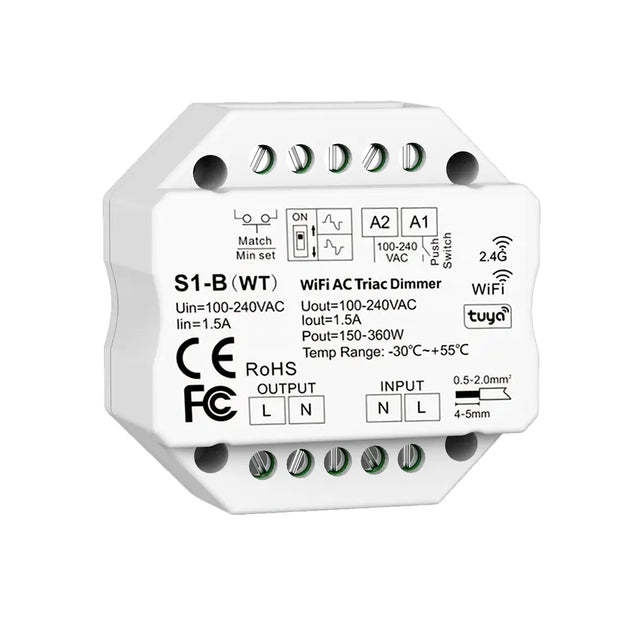This LED push dimmer with phase-cut or leading-edge (trailing-edge and leading-edge) is a type of dimmer that can be used to control the brightness of LED lamps via a push button or wirelessly with an RF remote control. The dimmer has a dip switch that allows you to choose whether to use phase-cut or leading-edge.